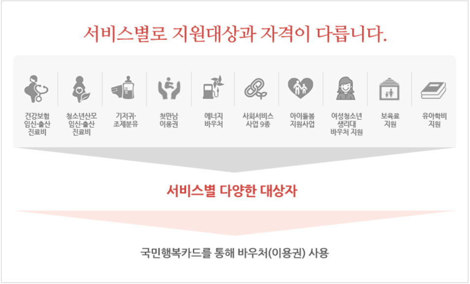 ● 국민행복카드로 바우처 서비스를 이용하기 위해서는 국민행복카드를 발급받고, 바우처 서비스 신청을 별도로 해야 합니다.