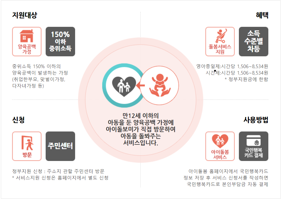 중위소득 150% 이하의 양육공백이 발생하는 가정(취업한부모, 맞벌이가정, 다자녀가정 등)에 아이돌보미가 직접 방문하여 아동을 돌봐주는 서비스입니다.