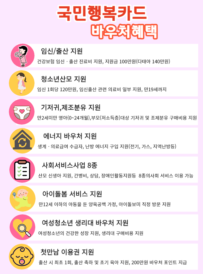 연회비는 무료이며 임신 사실 확인 후 발급받으면 됩니다. 바우처 카드로는 임신 출산 혜택뿐만 아니라, 에너지 바우처, 아이 돌봄 지원사업 유아학비 지원 등의 서비스를 받을 수 있습니다.